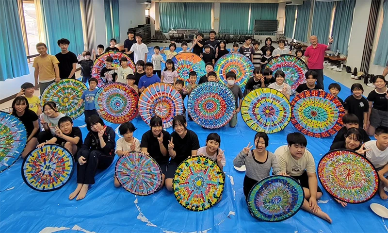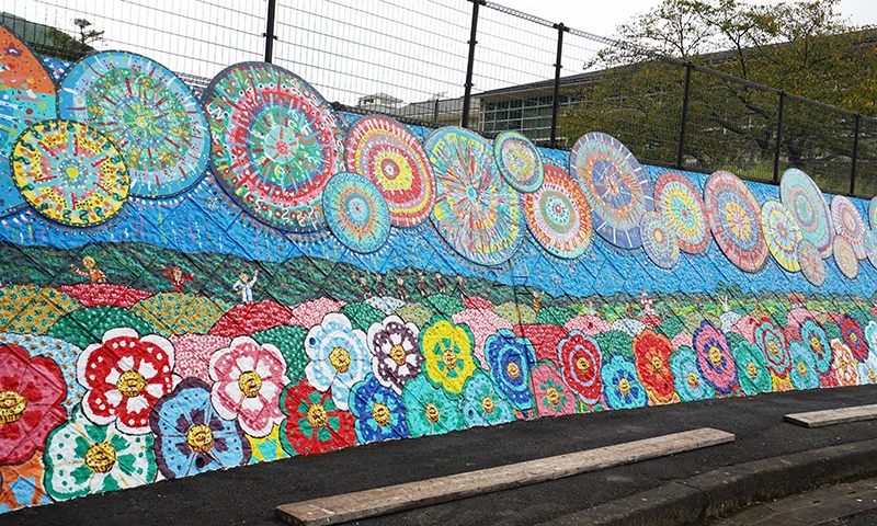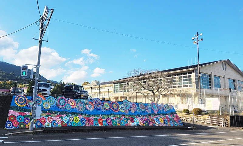 Together with all students of Yoshida Elementary and Junior High School and local community members, we created a mural on the wall in front of Yoshida Elementary School in the Yoshida district of Ureshino. The mural, inspired by the fireworks of the Yoshida summer festival, brings color to the community.