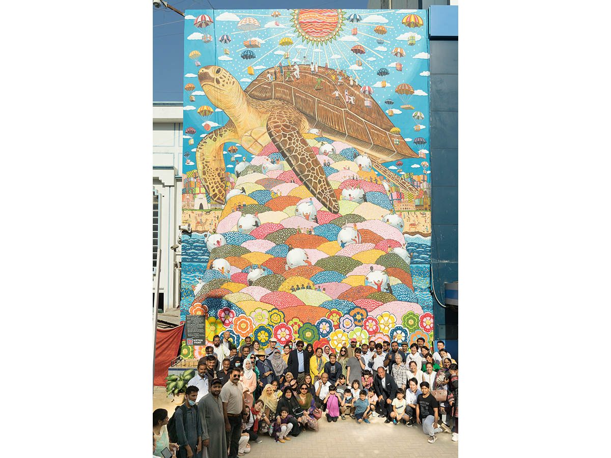 パキスタンにて日本の文化を伝える活動を行っているパキスタン·日本文化協会(シンド)のサポートを受け、パキスタン·日本国交樹立70周年記念事業の一つとしてカラチ市のNational Institute of Child Health(NICH)病院に壁画を制作した。NICHはシンド州政府が管轄しているベッド数553床という大病院で、子供たちは無料で治療を受けることができる。パキスタンでは、日本で義務教育を受ける年代にあたる子供たちの就学率が低いと言われている。その未就学の子どもたちの多くが労働力となっており、貧困も就学を妨げる原因となっている。そんなパキスタンの現状を鑑み、今回は現地の子供たちと、未来への大きな希望を抱ける壁画を制作した。