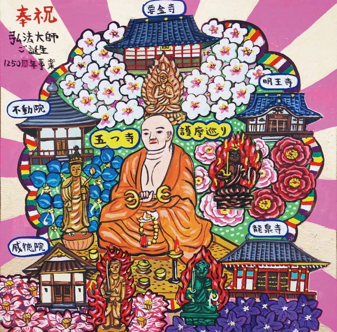 弘法大師空海(くうかい)の生誕1250年を記念し、栃木県大田原市の明王寺や威徳院など5寺院で行われた護摩めぐりの絵を制作。